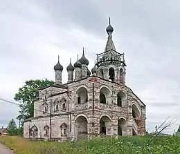 - 🌍 Trinity church in Podolez (Троицкая церковь в Подольце) (30 km from Yuryev). One of the most beautiful churches in the opole, the boyars of Miloslavskys had it built in 1659 in the newest Moscow style of the day. It's notable for its shape with a two-story porch continuing into the bell tower, and for the many stone carvings, patterns and windows. The church used to be in a shabby state and was restored around 2010, but not quite true to the original design but rather painting it in different colors. Nevertheless this did not do much damage to the church and its still quite pretty.