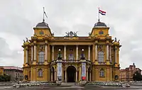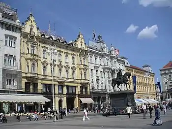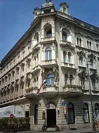 - 🌍 Palace Hotel, J.J. Strossmayer Square, ☏ +385 1 48-14-611. 4-star hotel. It was built in the Secession style in 1891 and converted into a hotel in 1905. The Arts Pavilion is 50 m away.