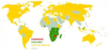 Passport holders of the following are eligible to get a visa on arrival to enter Zimbabwe for up to 3 months (for purpose of tourism) or for up to 30 days (for purpose of business): Albania, Algeria, Andorra, Argentina, Armenia, Australia, Austria, Azerbaijan, Bahrain, Belarus, Belgium, Bermuda, Bhutan, Bosnia and Herzegovina, Brazil, British Virgin Islands, Brunei, Bulgaria, Burundi, Canada, Cape Verde, Chile, China, Comoros, Costa Rica, Croatia, Cuba, Czech Republic, Denmark, Dominican Republic, Ecuador, Egypt, El Salvador, Equatorial Guinea, Estonia, Ethiopia, Finland, France, Georgia, Germany, Greece, Guatemala, Guyana, Haiti, Honduras, Hungary, Iceland, India, Indonesia, Iran, Ireland, Israel, Italy, Japan, Kazakhstan, Kuwait, Kyrgyzstan, Latvia, Liechtenstein, Lithuania, Luxembourg, Macao, Marshall Islands, Mexico, Micronesia, Moldova, Monaco, Netherlands, New Zealand, Nicaragua, Norway, Palau, Palestine, Panama, Papua New Guinea, Paraguay, Peru, Poland, Portugal, Romania, Russia, Rwanda, San Marino, Sao Tome and Principe, Senegal, Serbia, Slovakia, Slovenia, South Korea, Spain, Suriname, Sweden, Switzerland, Tajikistan, Turkey, Turkmenistan, Ukraine, United Arab Emirates, United Kingdom, United States, Uruguay, Uzbekistan, Vatican City and Venezuela.