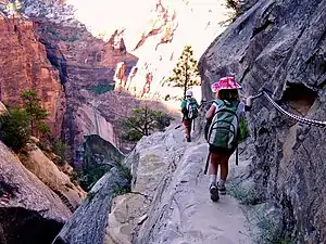 Be careful of steep cliffs; people have died falling when they venture too close to the edge. Some trails are more hazardous than others and should be attempted only by experienced hikers without a fear of heights. Loose sand and pebbles on stone are extremely slippery. Be extra careful near the edge when using cameras or binoculars. Never throw or roll rocks; there may be hikers below. Stay on the trail, stay away from the edge, observe posted warnings, and if you have children with you, watch them carefully!