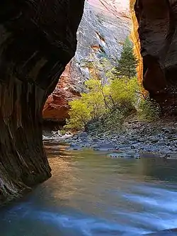 • 🌍 The Narrows. (9.4 mile / 15.1 km round-trip). Trailhead is at the Temple of Sinawava at the end of Zion Canyon, via Riverside Walk. This hike is accessible from Zion Canyon, but the full hike begins in East Zion and ends in Zion Canyon. The Narrows is an extremely popular off-trail hike. The route follows the North Fork of the Virgin River, along the floor of a very narrow canyon with impossibly high walls. This trek is one of the park's most amazing destinations. The full hike is a 16-mile (26-km) one-way trip. The Narrows may close at times due to high waters or flash-flood danger. Wading will be required, so wear footwear and leg coverings that can get wet. Water depth in June 2007 was approximately mid-thigh. The river flows right up to the canyon walls for much of the hike, so you can't avoid wading. The water can be fairly cold and the creekbed is rocky, so your favorite pair of old tennis shoes will probably not cut it. Several outfitters in neighboring Springfield will rent you appropriate footwear, usually heavy-soled neoprene boots. Sturdy hiking poles, which can also be rented, will help navigate the river.