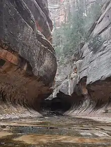 It's the surprisingly porous Navajo sandstone that makes up the high cliffs of Zion. Rainfall and snow melt collect on the top of the mesas and seep through the sandstone until it reaches the tougher Kayenta formation, where it is forced out of the rock, creating springs in Zion Canyon and allowing hanging gardens to grow. Perhaps the most famous example of this is Weeping Rock, which lies below the mouth of two hanging canyons. The canyons serve as drainages, collecting surface water runoff and concentrating it into the Navajo sandstone, supporting the Weeping Rock spring. Other springs can be seen in various places of the park including along the Riverside Walk at the Temple of Sinawava.