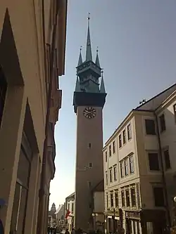 - Town hall tower The tower nearly 80 m high was built in the years 1447-1448 by the local builder Mikuláš of Sedlešovice. The gallery offers a view of the town and of the surroundings, even of the Austrian Alps. Admission 20/10Kč.